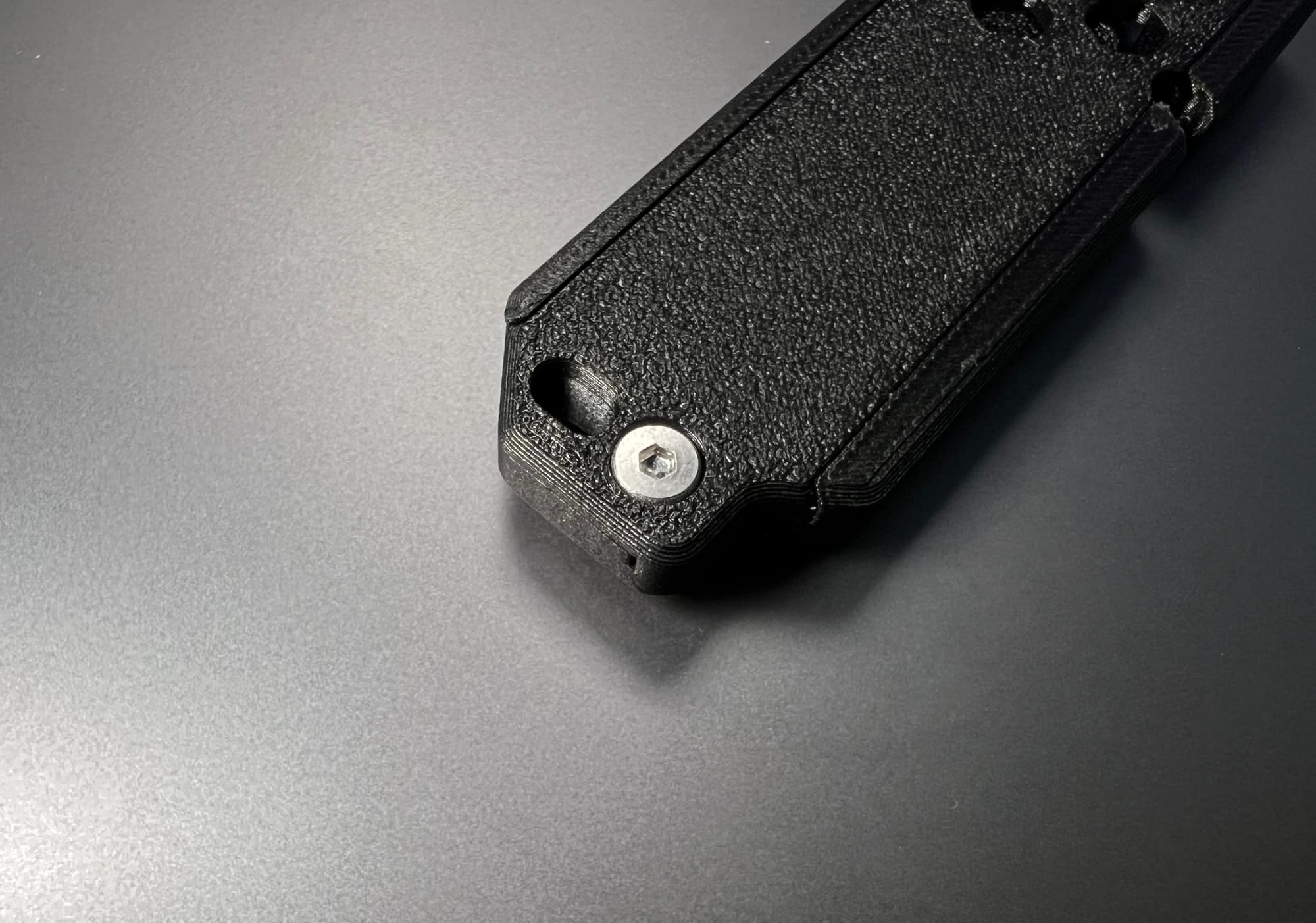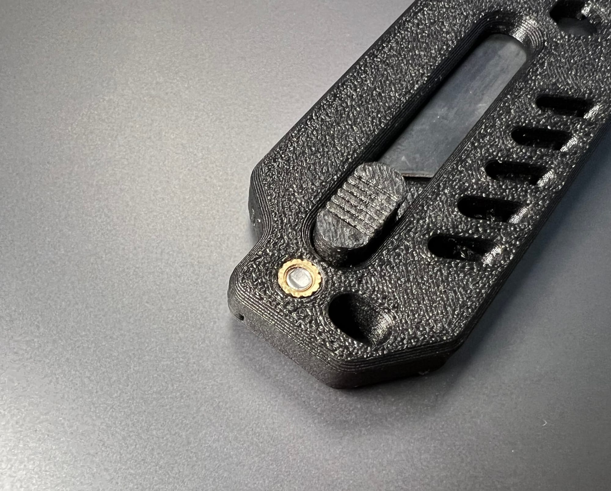 前两个月打印了 https://makerworld.com/en/models/1403670-edc-friendly-lightweight-utility-knife-ii 里面的美工刀的刀套。因为设计师追求无工具安装,导致上下两片外壳安装后有一定公差,能前后滑动给人一种不安心的感觉。非常不爽。今天没忍住,在模型上加了个热压螺母和螺丝,把它固定的死死的。